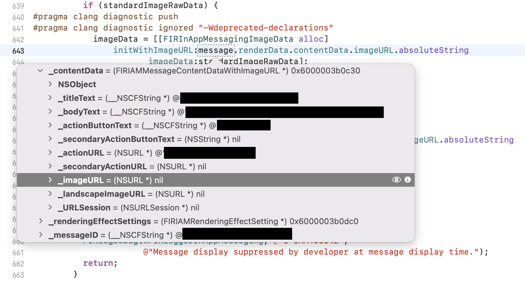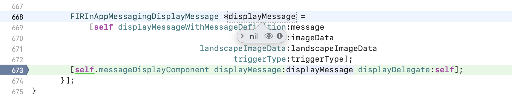 imageDataparameter inFIRInAppMessagingDisplayMessageinitializer is notnullable, so the entiredisplayMessageobject becomesnil; FIRInAppMessagingDisplay’sdisplayMessage:displayDelegate:method assumesmessageForDisplayis not optional, so when anilis received in the Swift runtime, a crash occurs.