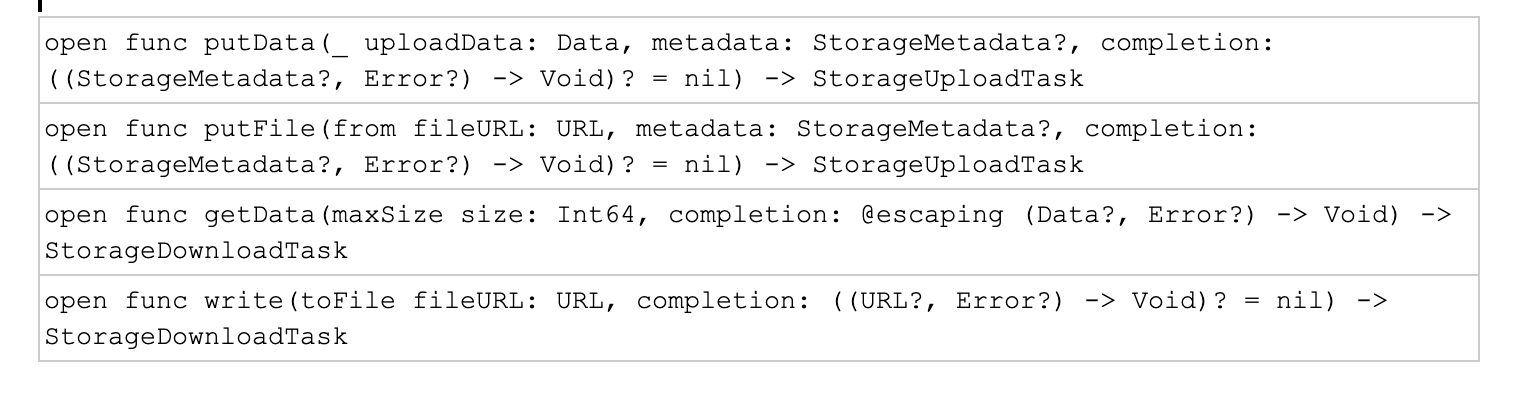 Googlers can see the API proposal at go/firebase-storage-async-await1. An excerpt follows: