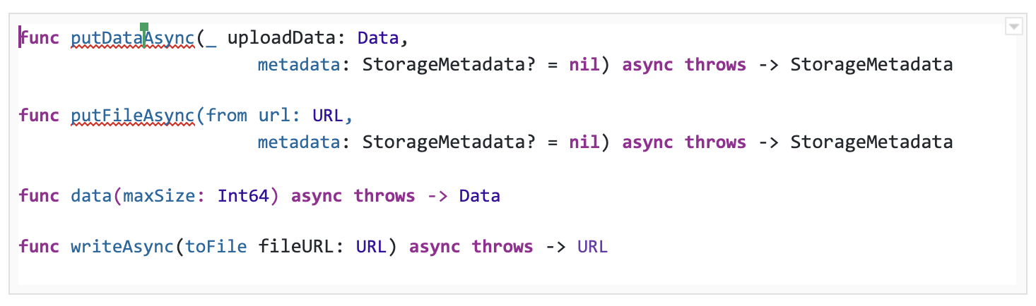 For Storage, Xcode automatically converts the following APIs to async versions as shown here: